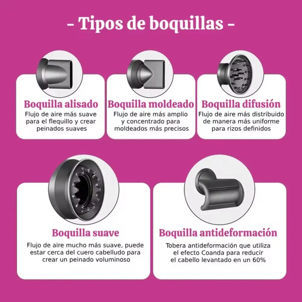 Sistema 5 en 1: accesorios para secado rápido, alisado, rizos, volumen y precisión.